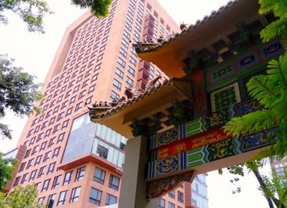 China Town Gate and Foreign Affairs Office Tower near Alameda Park .